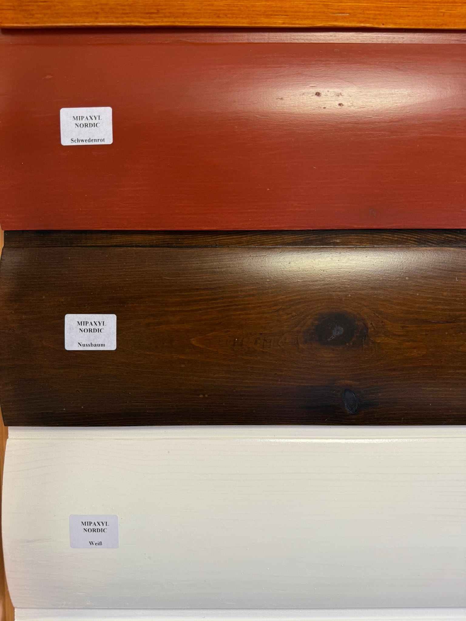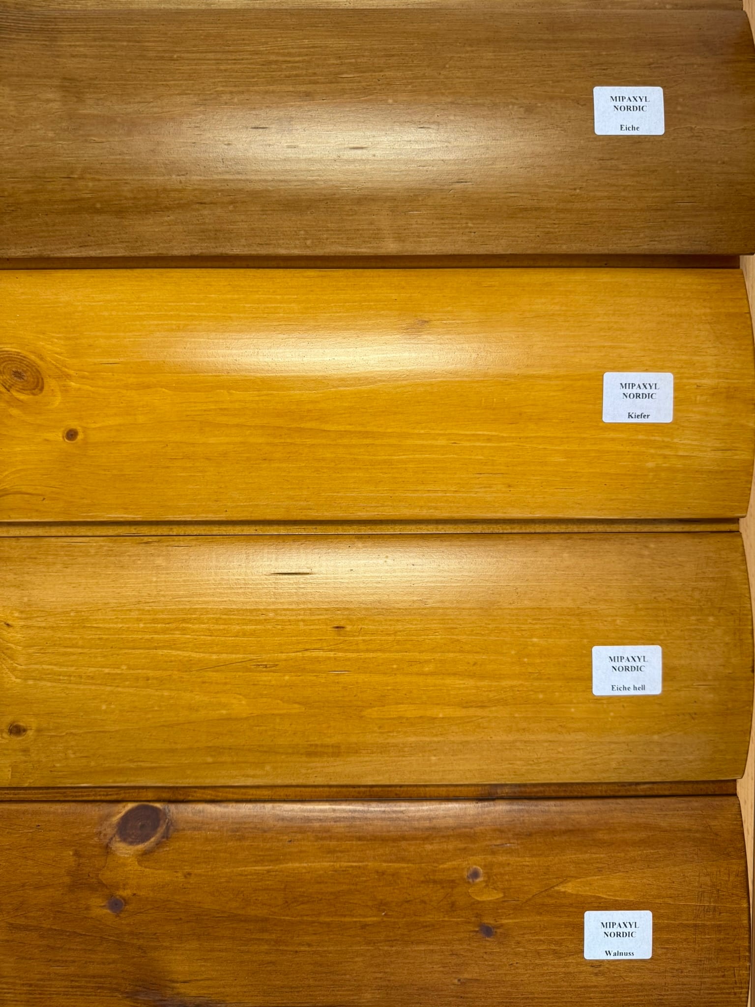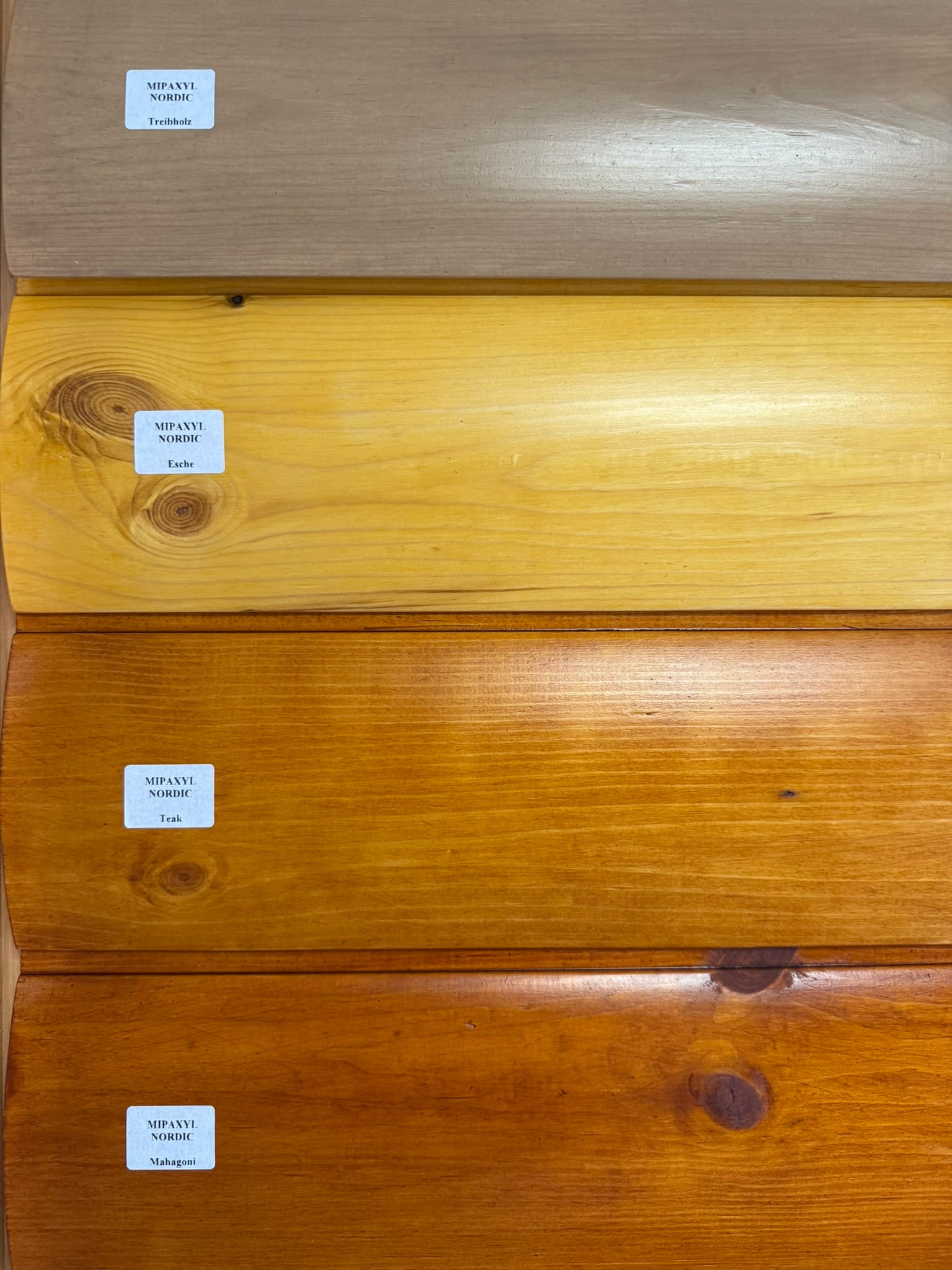 Pastabos: Dažymo metu dėvėkite apsauginius drabužius. Saugokite gretimas vietas. Įpylus pigmentinių pastų, gerai suplakite produktą (bent 5 minutes). Prieš naudojimą gerai išmaišykite. Tolygiai užtepkite ir paskleiskite „Mipaxyl Nordic“, kad išvengtumėte dėmių ir skirtingo blizgesio, atsirandančių dėl skirtingo sluoksnio storio. Galutinis atspalvis iš esmės priklauso nuo natūralios medienos spalvos, tankumo, užtepto kiekio, impregnanto spalvos atspalvio ir dažyvės spalvos atspalvio (žr. spalvų paletę). Todėl rekomenduojama atlikti bandomąjį dažymą ant originalios medienos, kad būtų galima teisingai įvertinti galutinį atspalvį. Norint užtikrinti identiškus spalvų atspalvius, ant paviršiaus reikia naudoti tik to paties partijos numerio produktus! Norint užtikrinti gerą atsparumą oro sąlygoms, reikia tepti du spalvotus sluoksnius. Geriausias atsparumas oro sąlygoms yra tarpinių spalvų; per ryškių arba per tamsių spalvų nereikėtų naudoti esant ekstremalioms oro sąlygoms. Jei reikia atnaujinti paviršių neatnaujinat spalvos, naudokite „Mipaxyl“ UV apsaugą dėl papildomos apsaugos nuo UV spindulių. Periodinė ir profesionali priežiūra yra būtina nudažytų medinių dalių ilgam tarnavimo laikui.